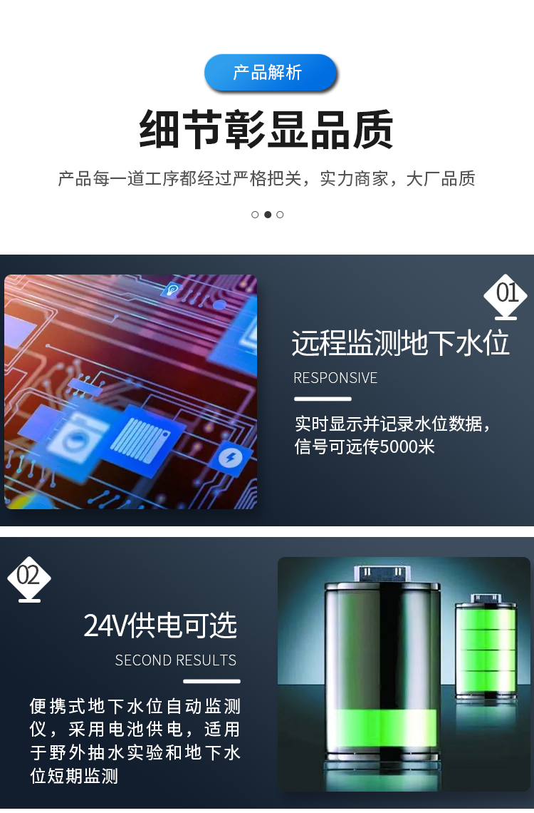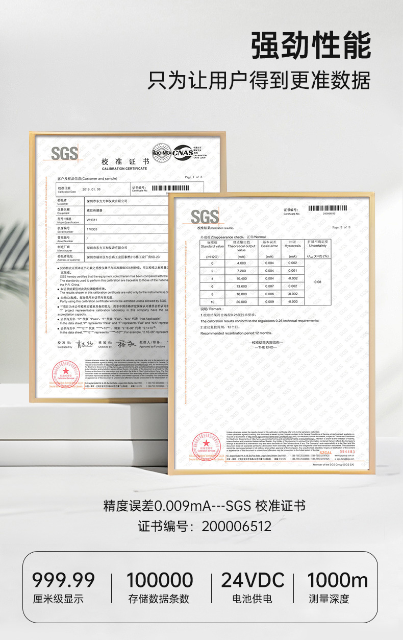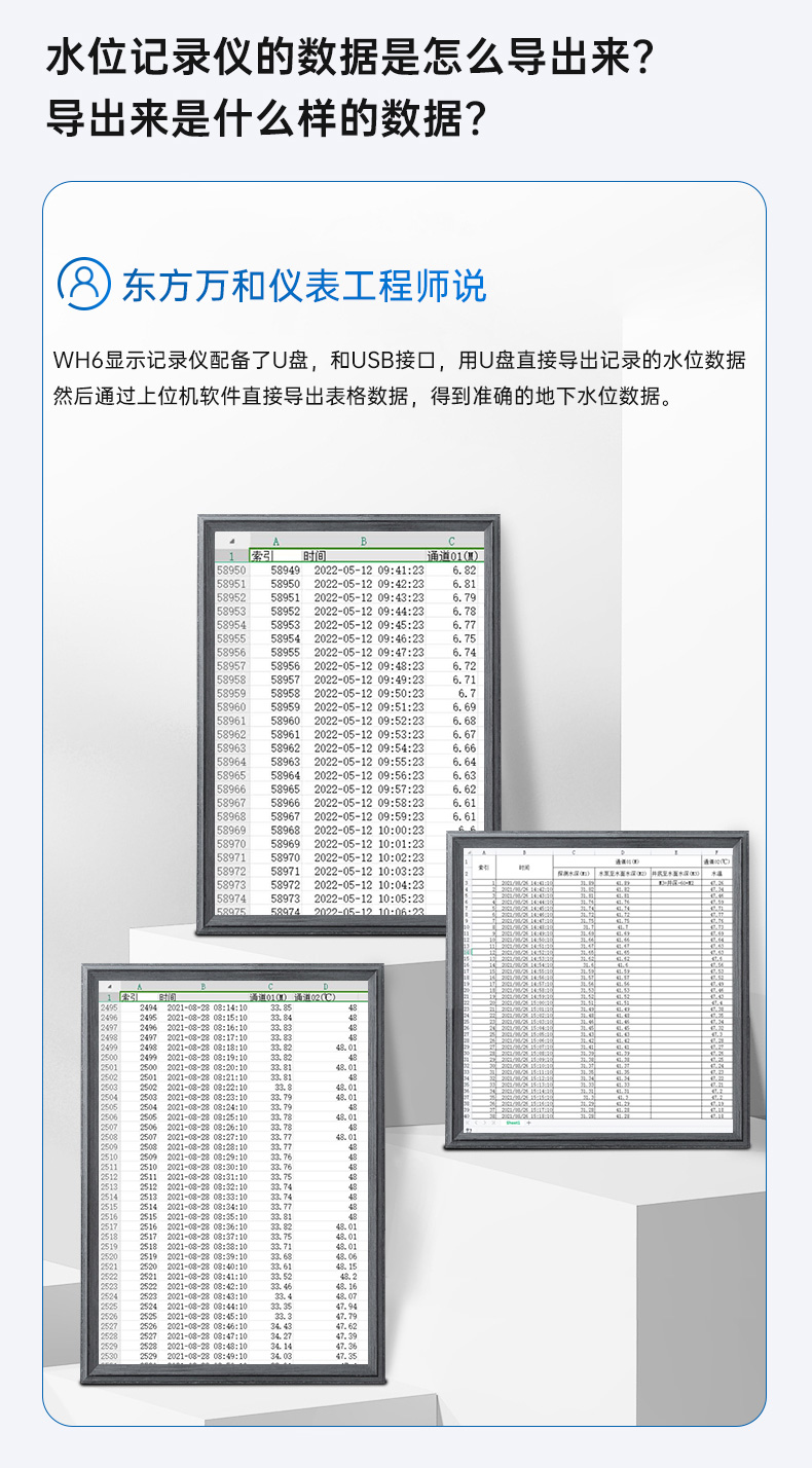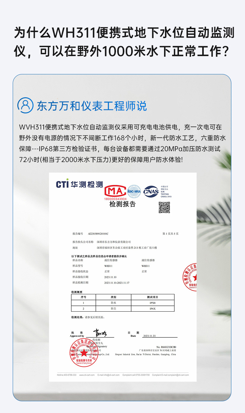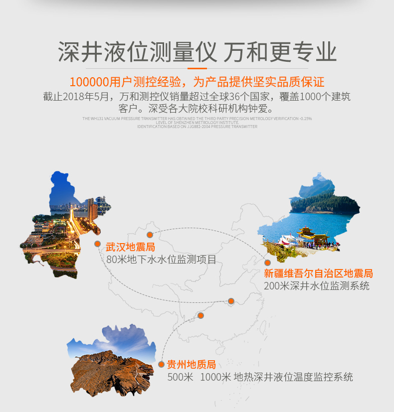 WH311地下水位自动监测仪在地热井勘探 、深井抽水试验、地下水位监测中都有广泛的应用。其测量范围能够达到100米、300米甚至1000米,主要是基于WH311内置的超强抗高压高密封性传感器芯片,一体式成型结构可耐2000米水压防水测试,信号传输采用聚氨酯抗拉抓力钢丝电缆,确保信号能实时的,高精度稳定的输出显示。配套WH6专用显示记录仪,1分钟记录一次数据,可自动记录365天数据,智能生成表格历史数据。 万和仪表地下水位自动监测仪已经应用在新疆、贵州地质局、武汉地震局、西南工程等勘探现场,直接解决了地下水位监测困难的问题。