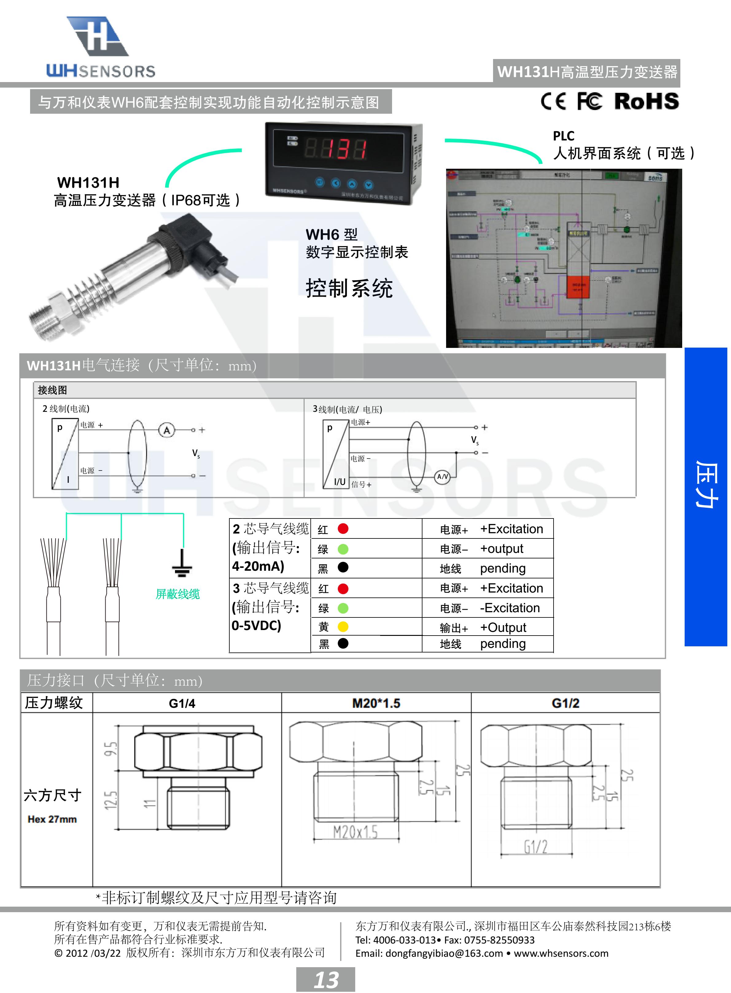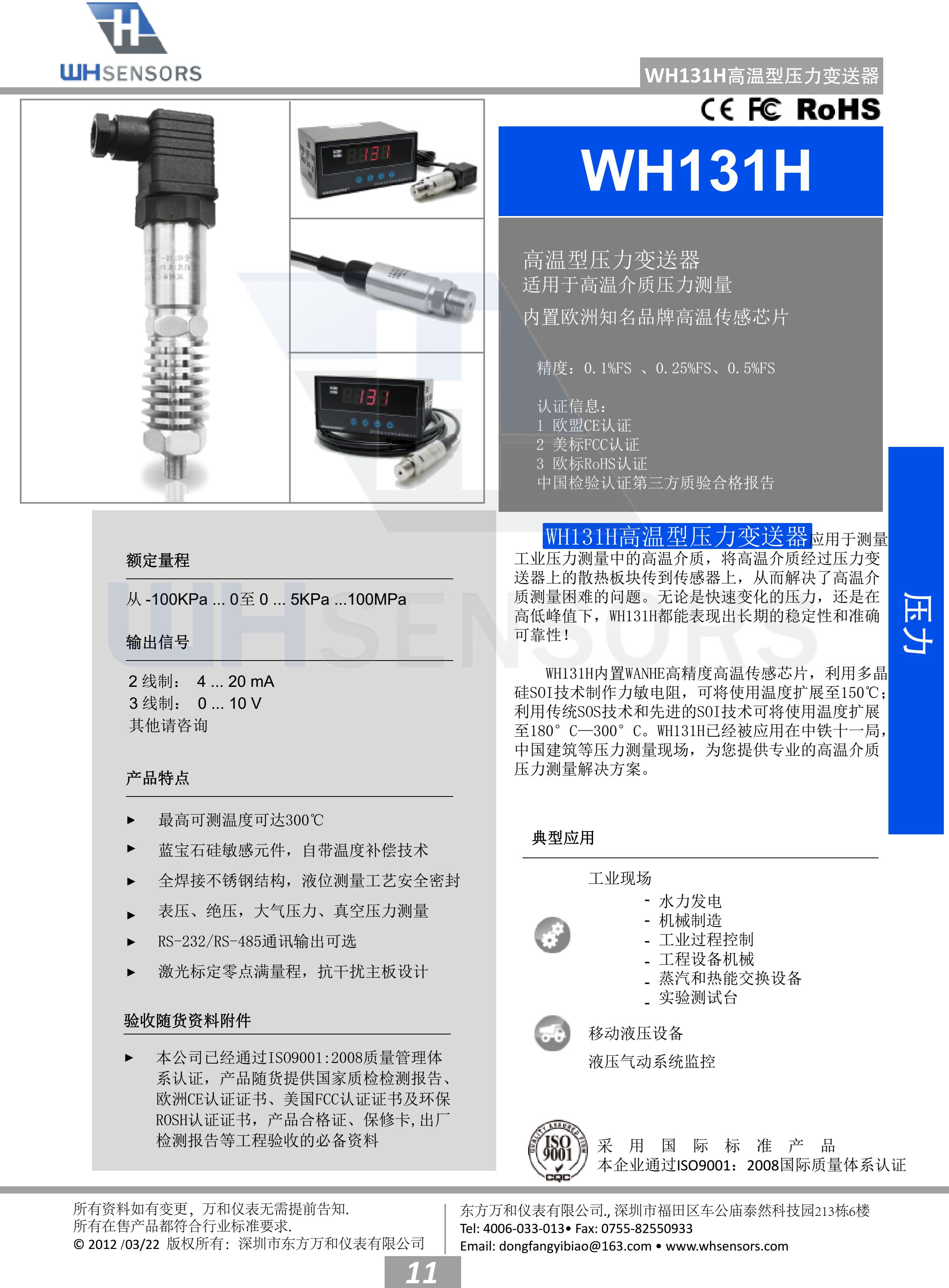 WH131H高温压力变送器采用高精度蓝宝石压力传感器,并经过特定的信号提取及剥离等技术进行温度及线性化补偿,蓝宝石系由单晶硅绝缘元素组成,不会发生滞后、疲劳和蠕变现象;蓝宝石有着非常好的弹性和绝缘特性,对温度变化不敏感,即使在高温条件下,也有着很好的工作特性;