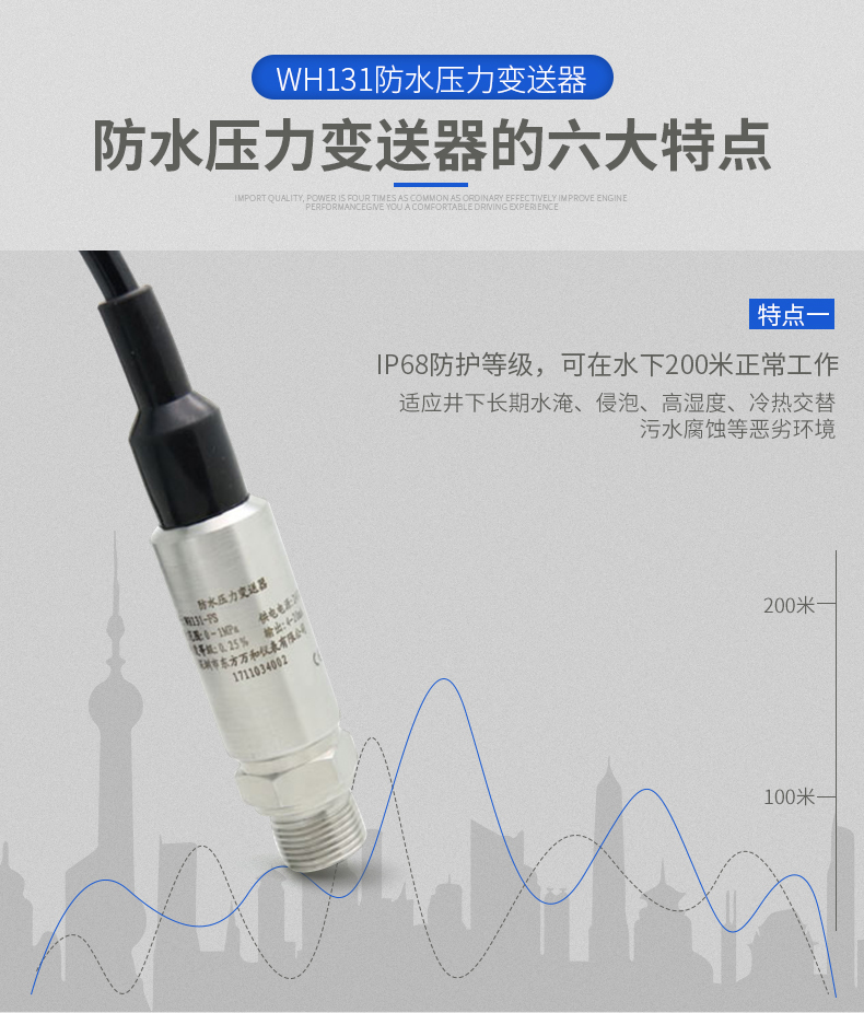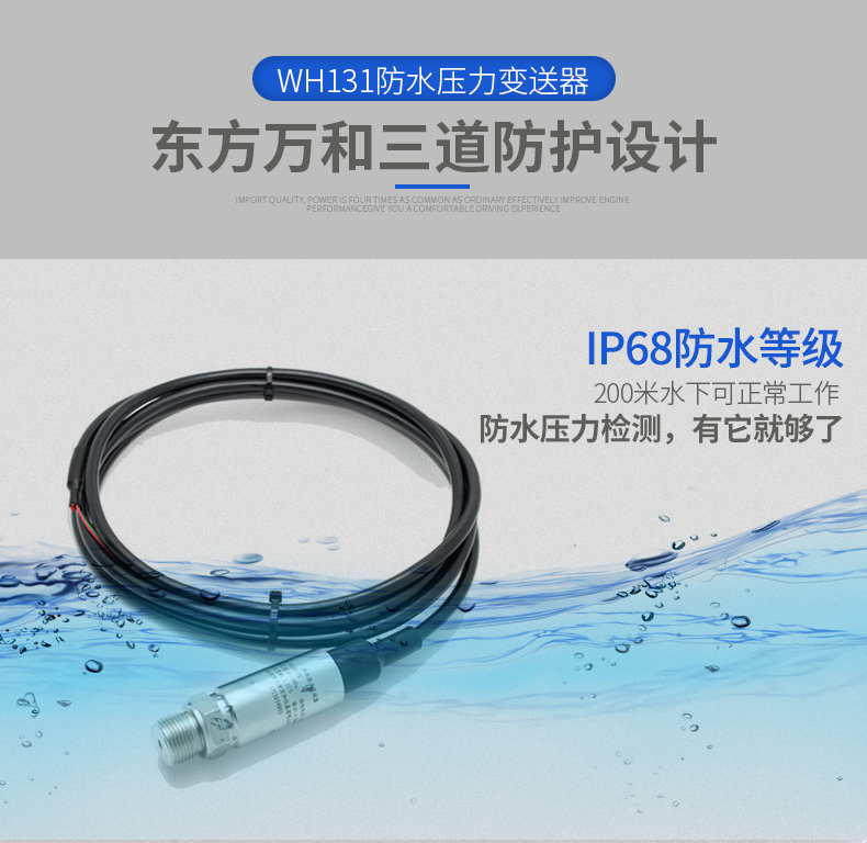 WH131系列防水型压力变送器选用国际著名公司高精度,高稳定性压力传感器组件,采用了投入式液位的生产工艺。使得整体产品的防护等级达到了IP68,经过高可靠性的放大电路及精密温度补偿,适用于各种工况环境恶劣或者露天安装的压力测量控制设备的配套使用。