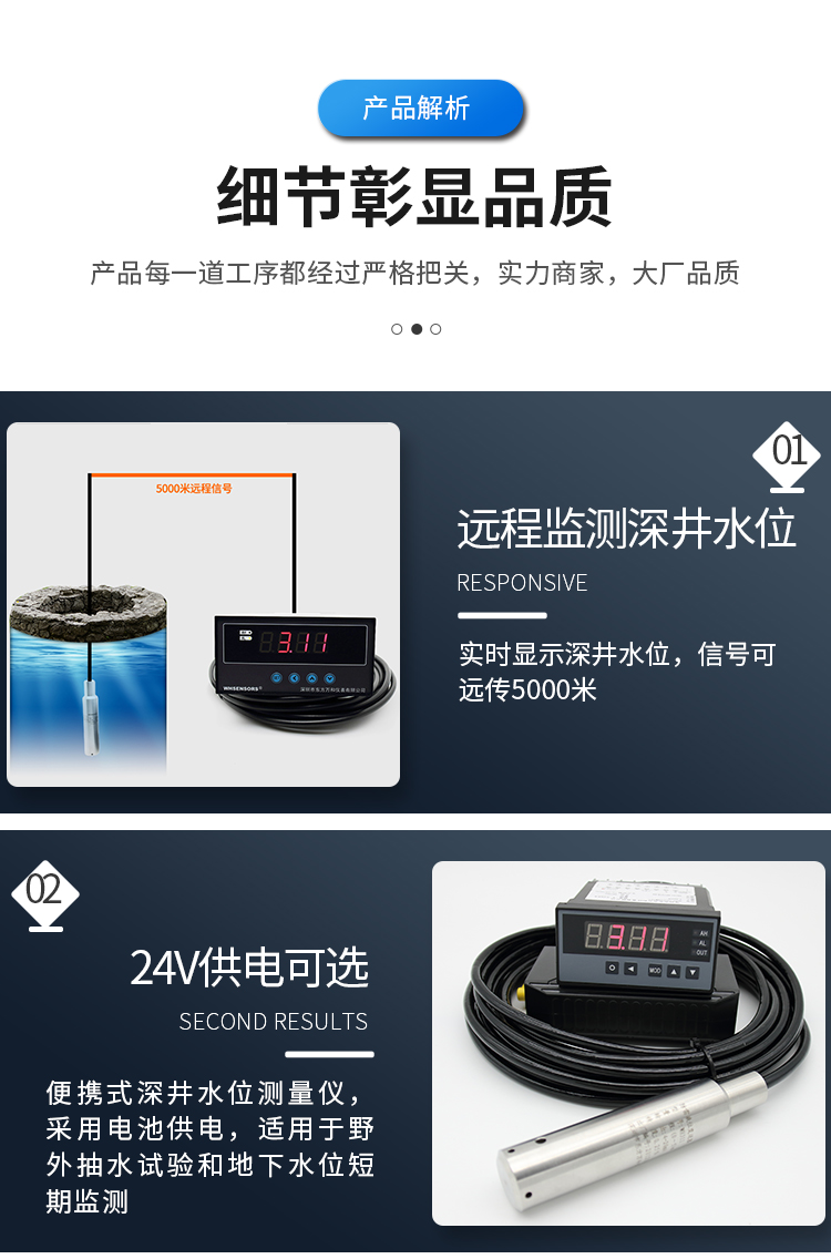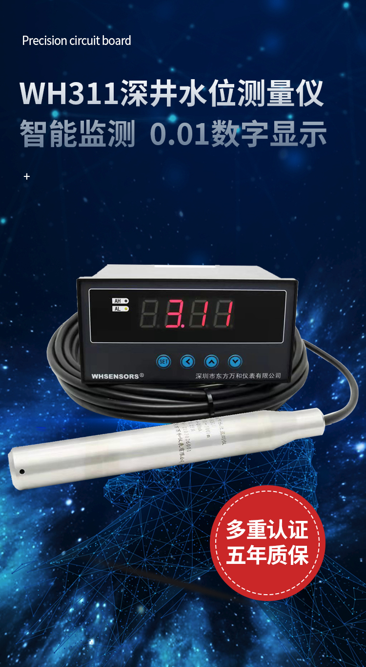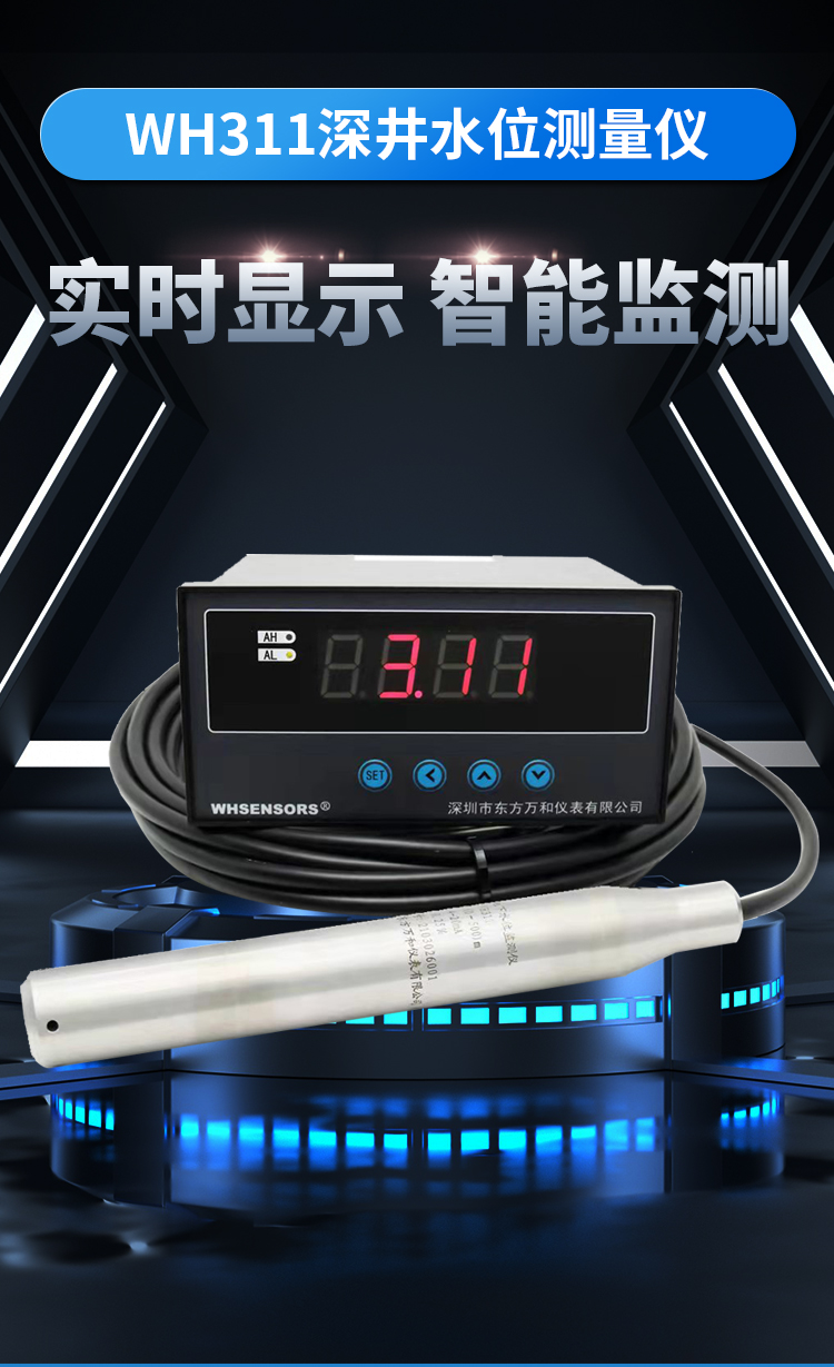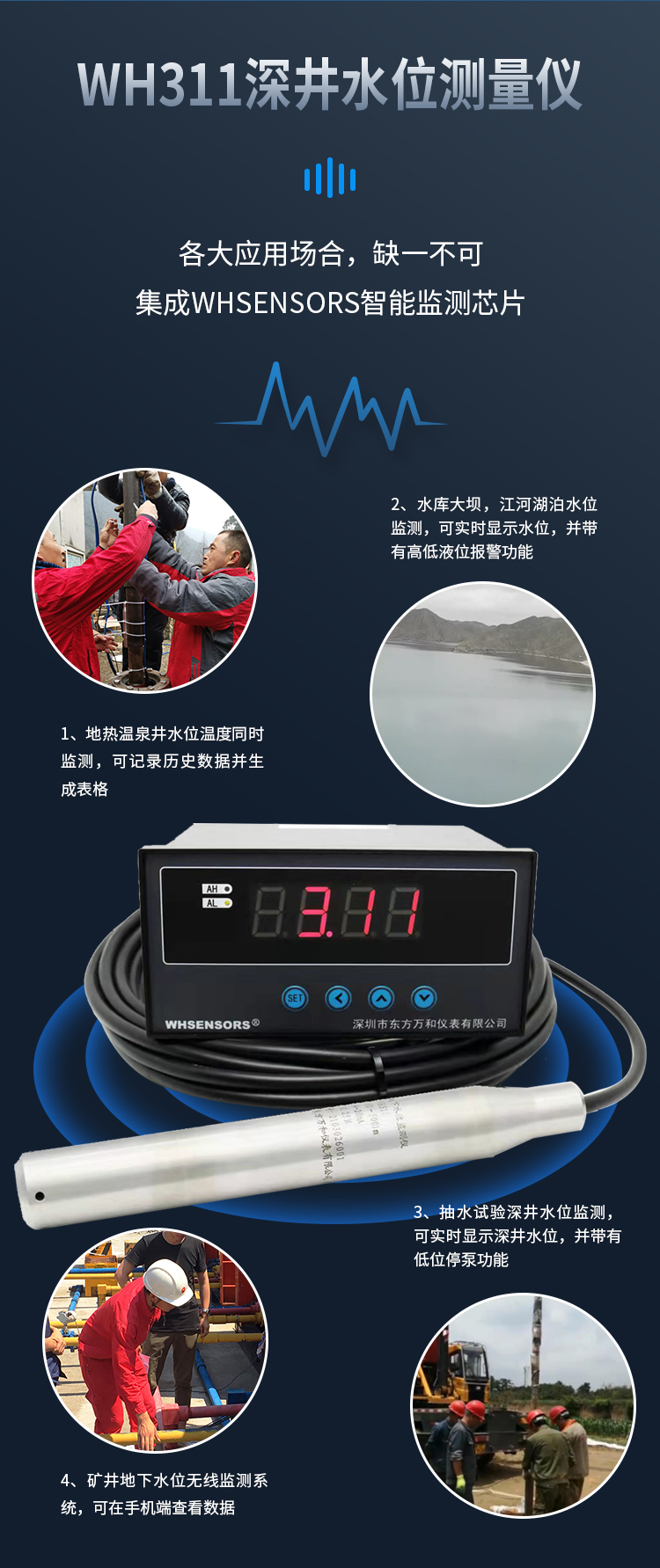 深井专用液位变送器WH311专为 深井液位测量而设计,针对深井量程比较大,其测量范围能够达到100米、300米甚至1000米,主要是基于WH311内置的超强抗高压高密封性传感器芯片,一体式成型结构可耐2000米水压防水测试,信号传输采用聚氨酯抗拉抓力钢丝电缆,确保信号能实时的,高精度稳定的输出显示。