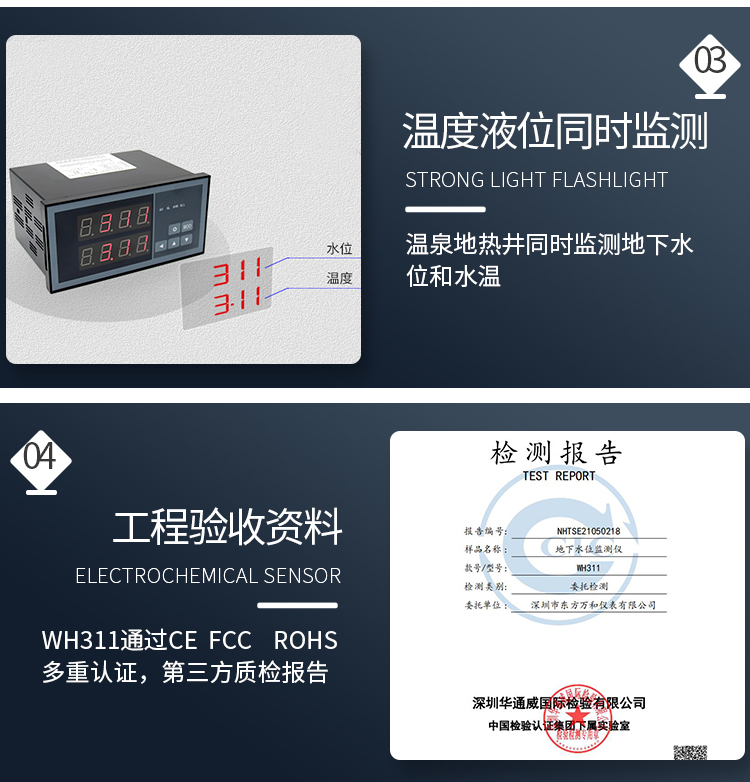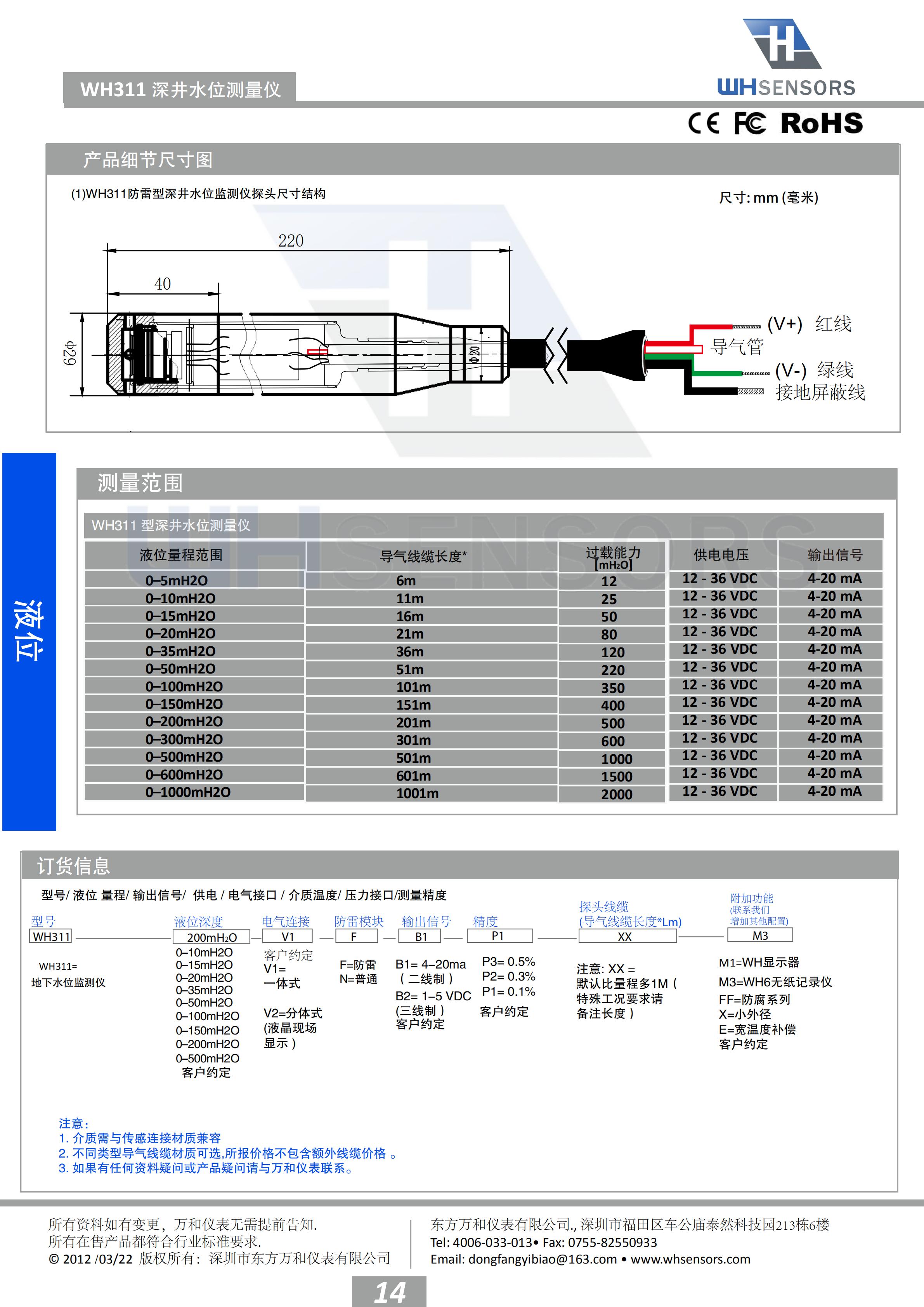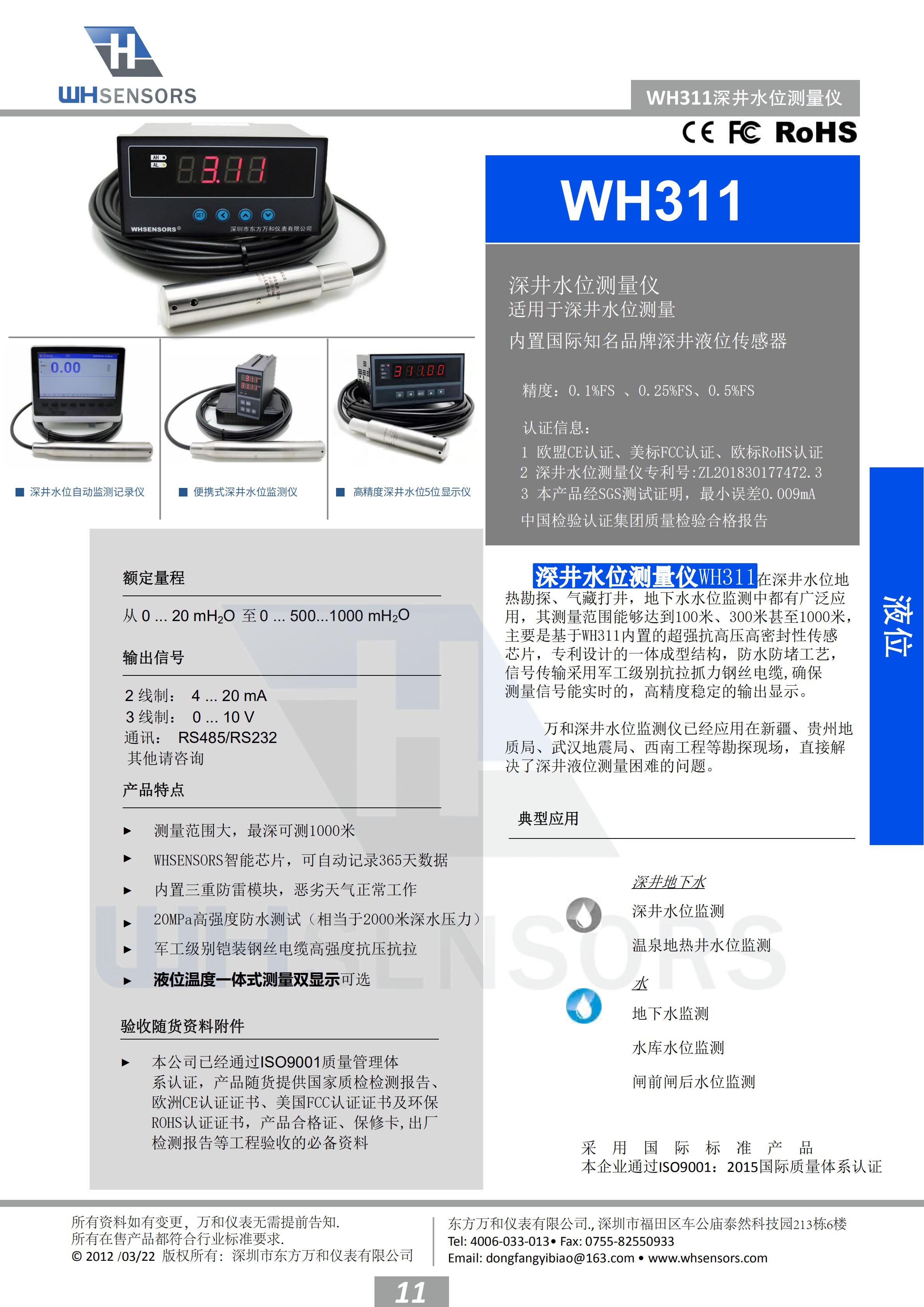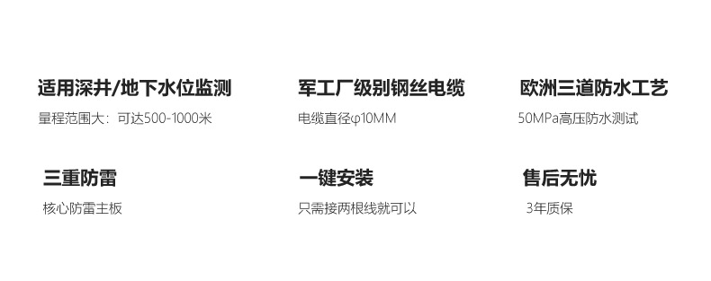 深井专用液位变送器WH311专为 深井液位测量而设计,针对深井量程比较大,其测量范围能够达到100米、300米甚至1000米,主要是基于WH311内置的超强抗高压高密封性传感器芯片,一体式成型结构可耐2000米水压防水测试,信号传输采用聚氨酯抗拉抓力钢丝电缆,确保信号能实时的,高精度稳定的输出显示。