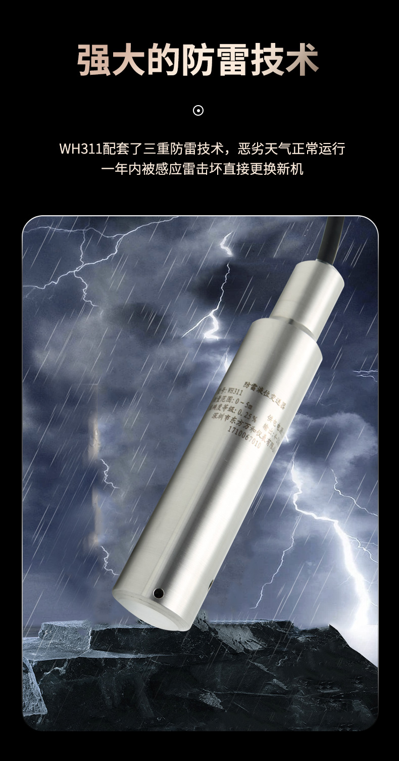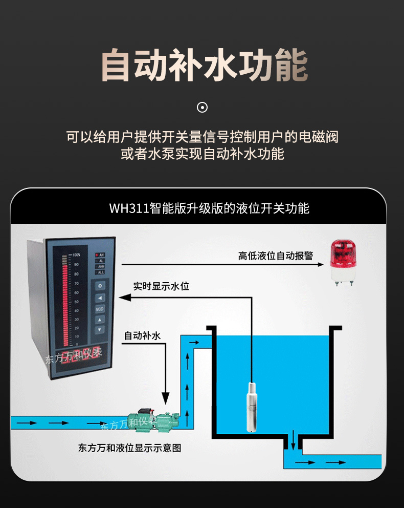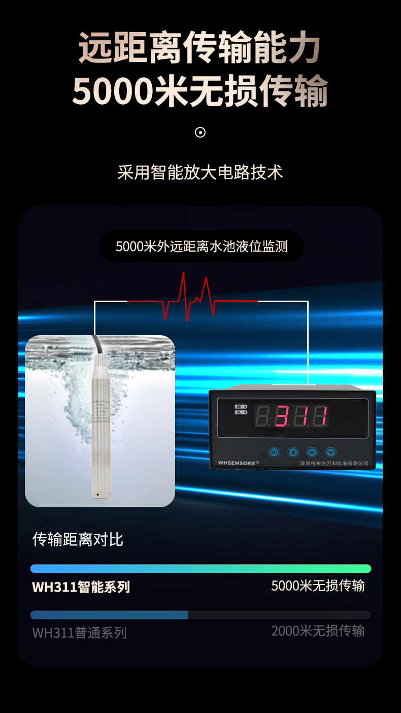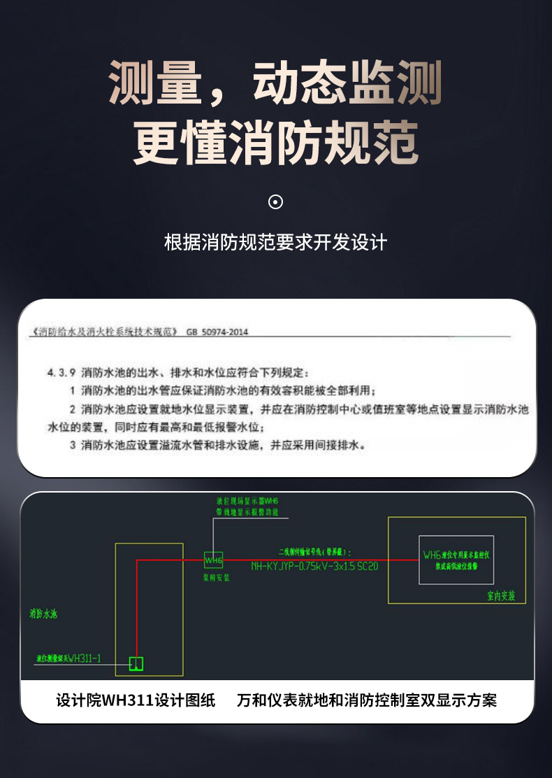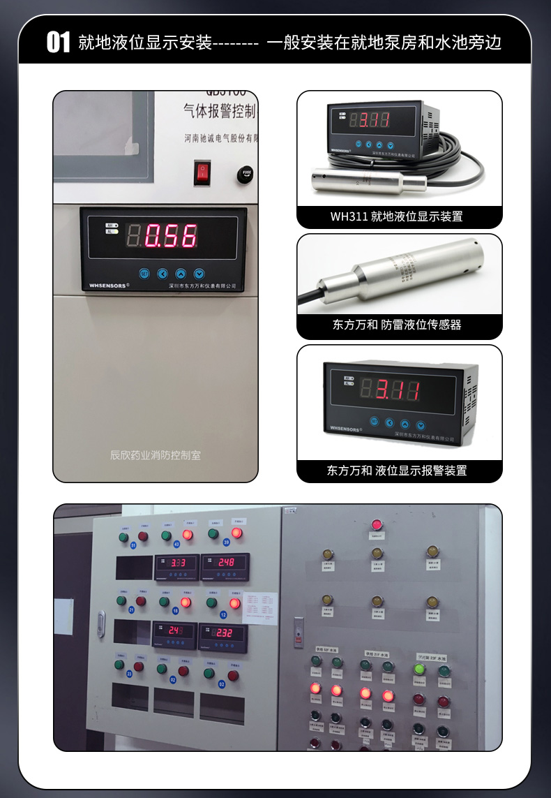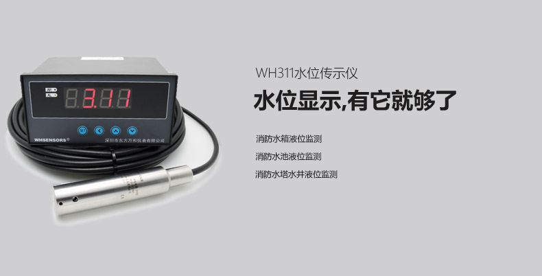 WH311水位传示仪应用于水池水箱的水位测量,实时远传显示(最远可达5公里)。其中WH311防雷水位探头直接投入安装到水池或者水箱的底部,WH6液位专用显示器安装在控制室,实时监测水箱水池的实时水位,并带有高低液位报警功能,可辅助控制水泵自动补水排水,确保水池水箱系统保持高水位正常运行。 WH311水位传示仪专已应用于万达地产、耀宝地产 等多家建筑住宅安防现场,有效解决液位远传测量问 题的同时,助力楼宇安全数字化监控。