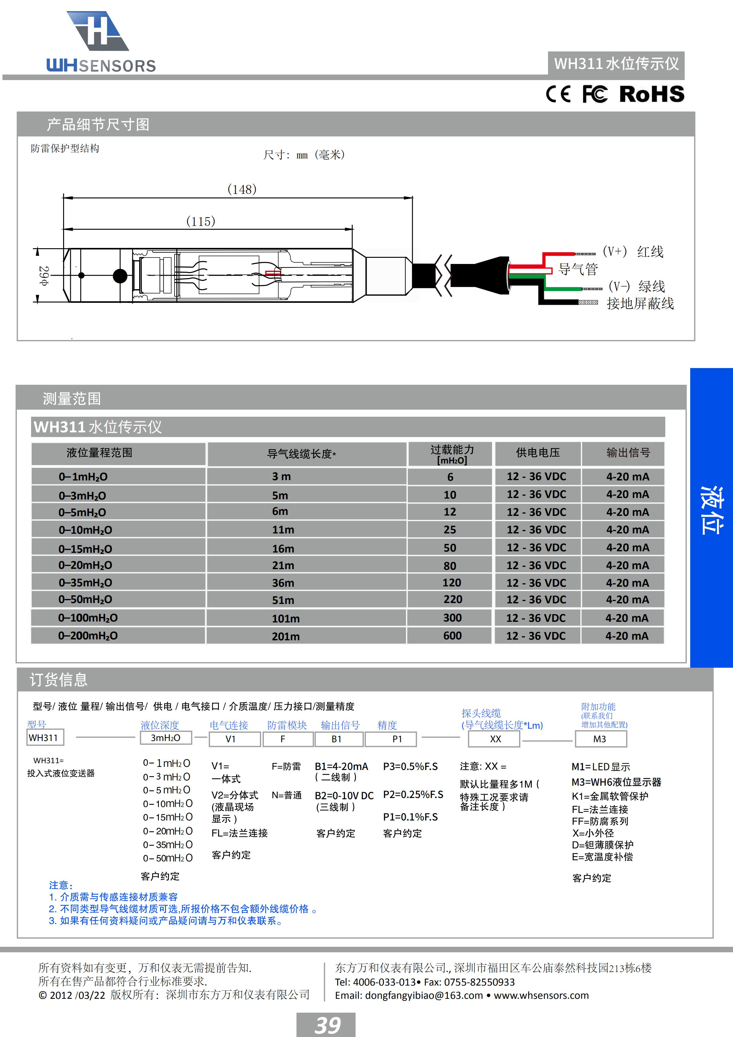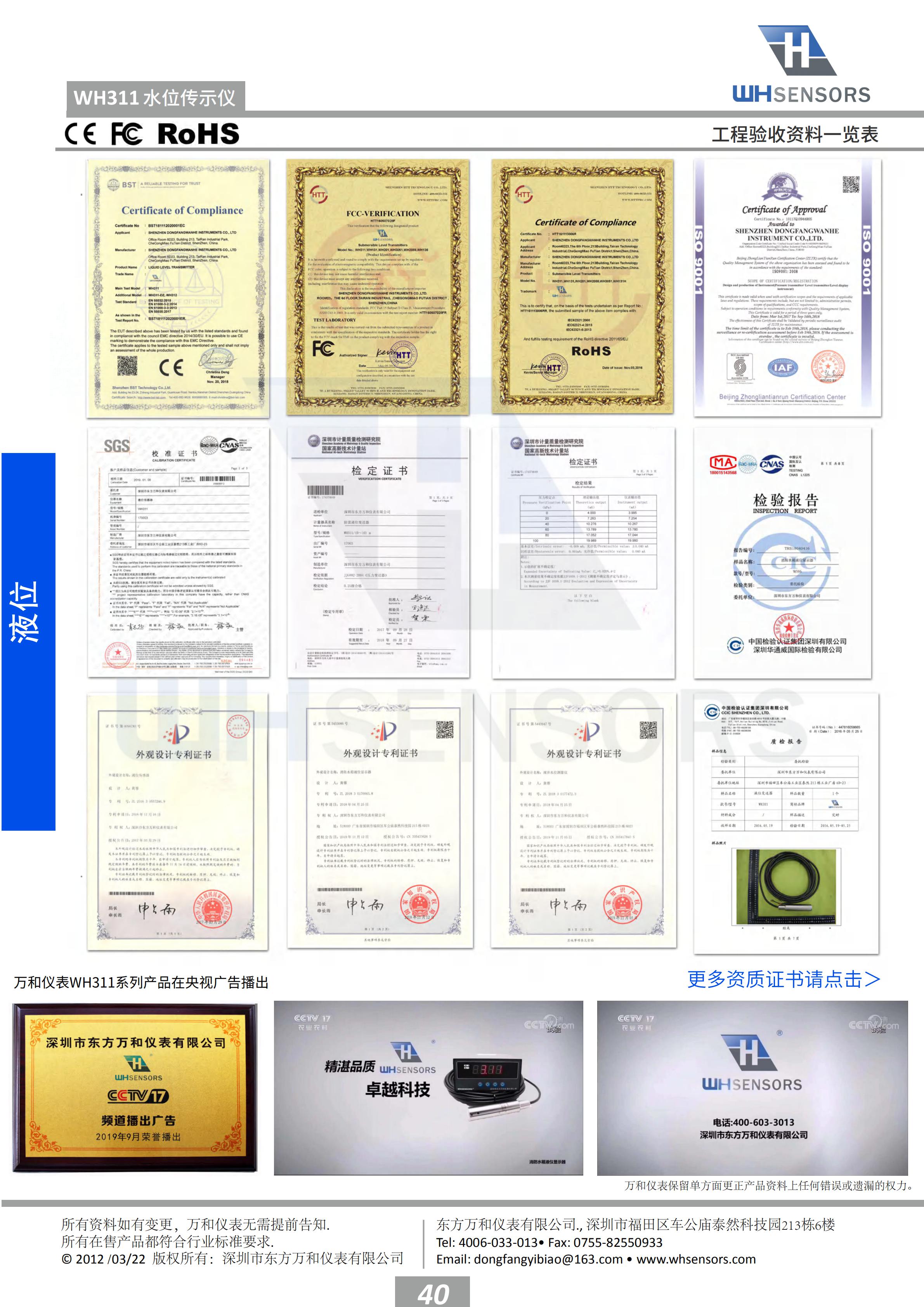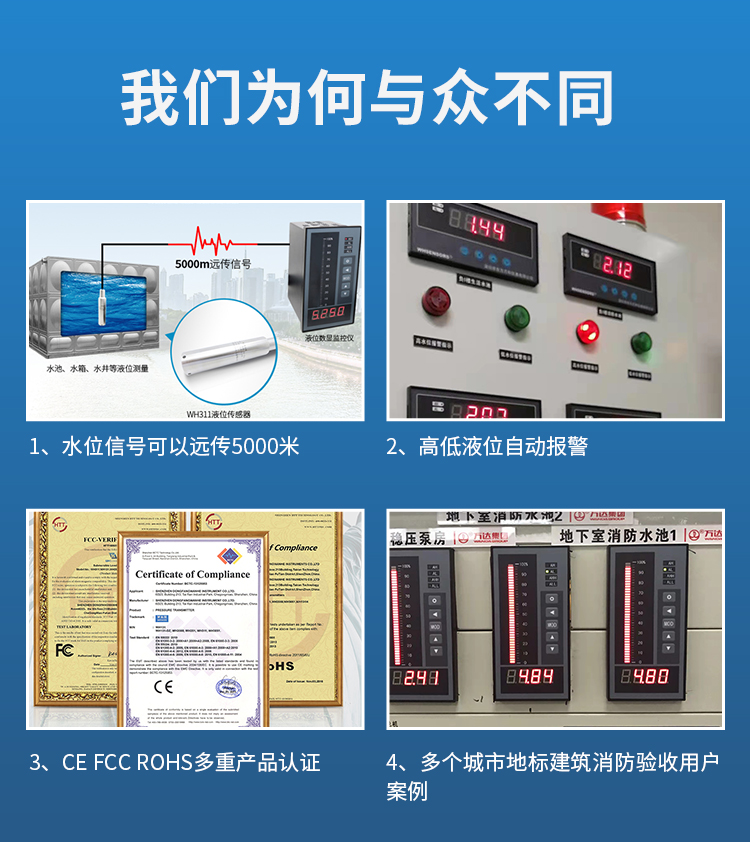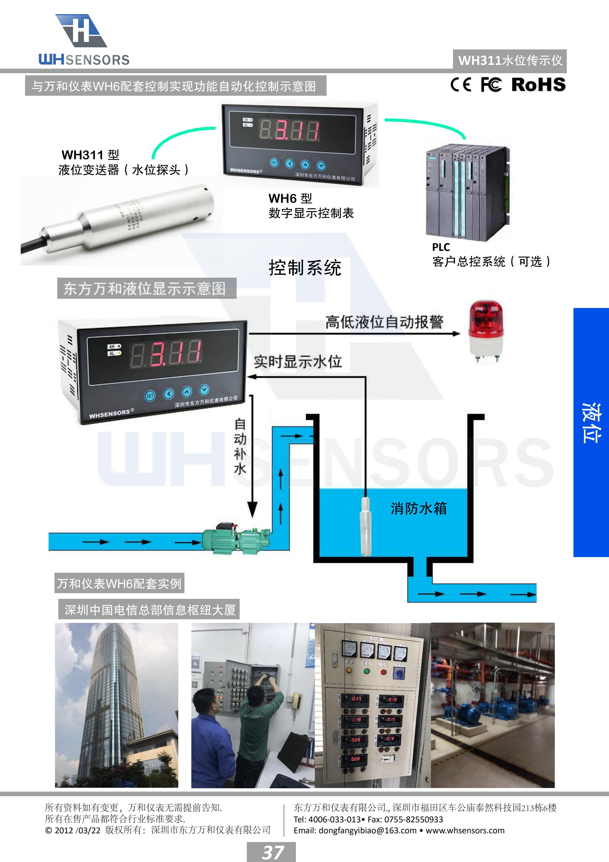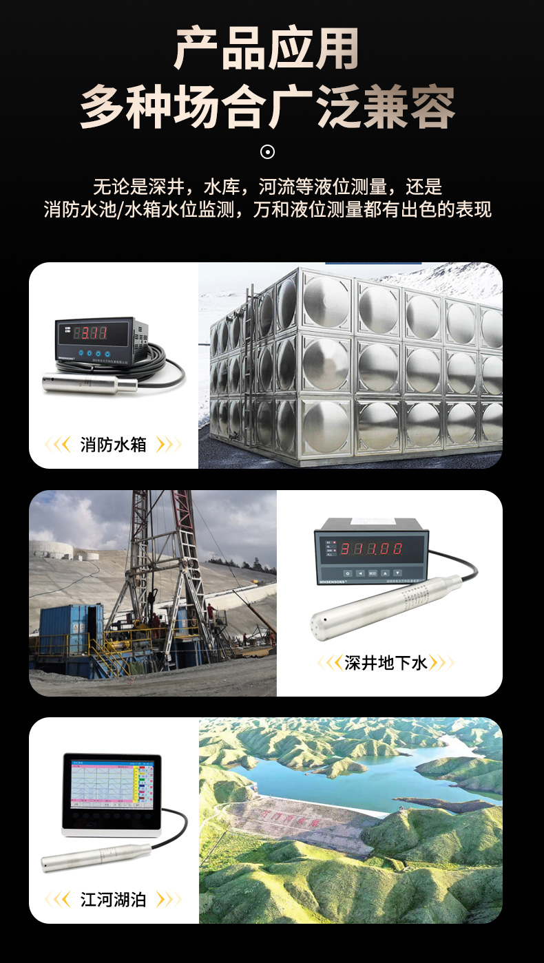 WH311水位传示仪应用于水池水箱的水位测量,实时远传显示(最远可达5公里)。其中WH311防雷水位探头直接投入安装到水池或者水箱的底部,WH6液位专用显示器安装在控制室,实时监测水箱水池的实时水位,并带有高低液位报警功能,可辅助控制水泵自动补水排水,确保水池水箱系统保持高水位正常运行。 WH311水位传示仪专已应用于万达地产、耀宝地产 等多家建筑住宅安防现场,有效解决液位远传测量问 题的同时,助力楼宇安全数字化监控。