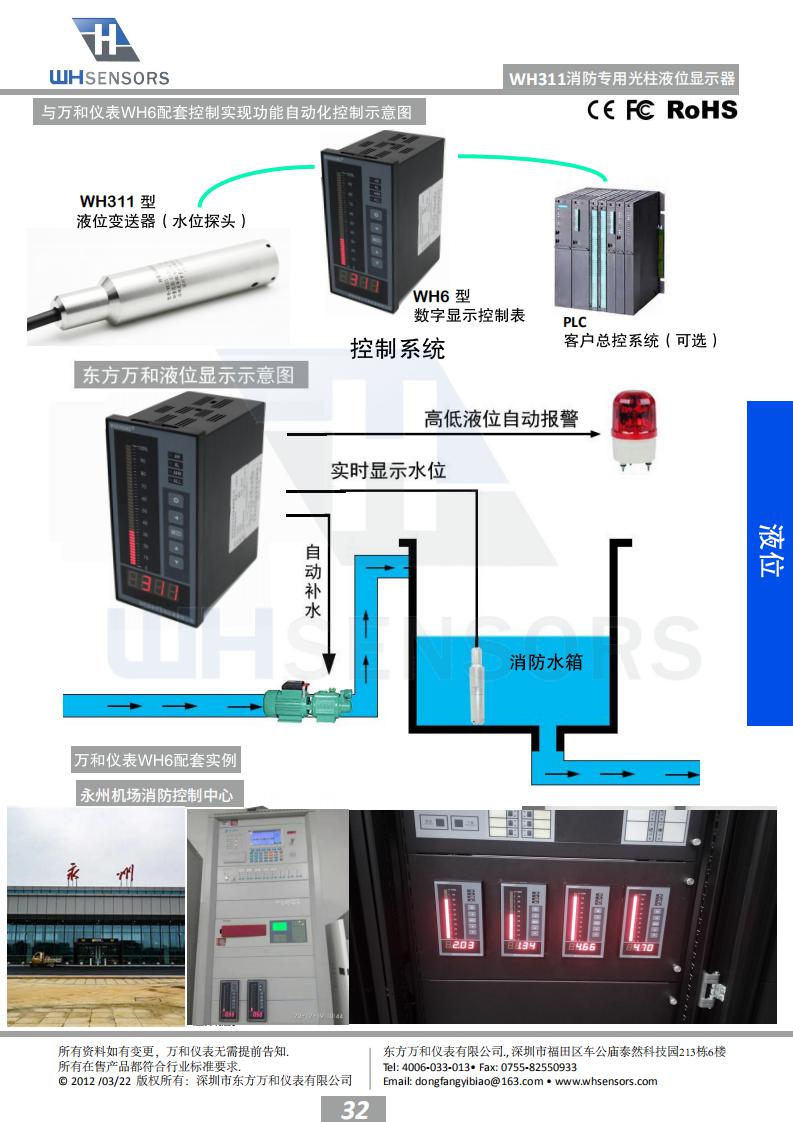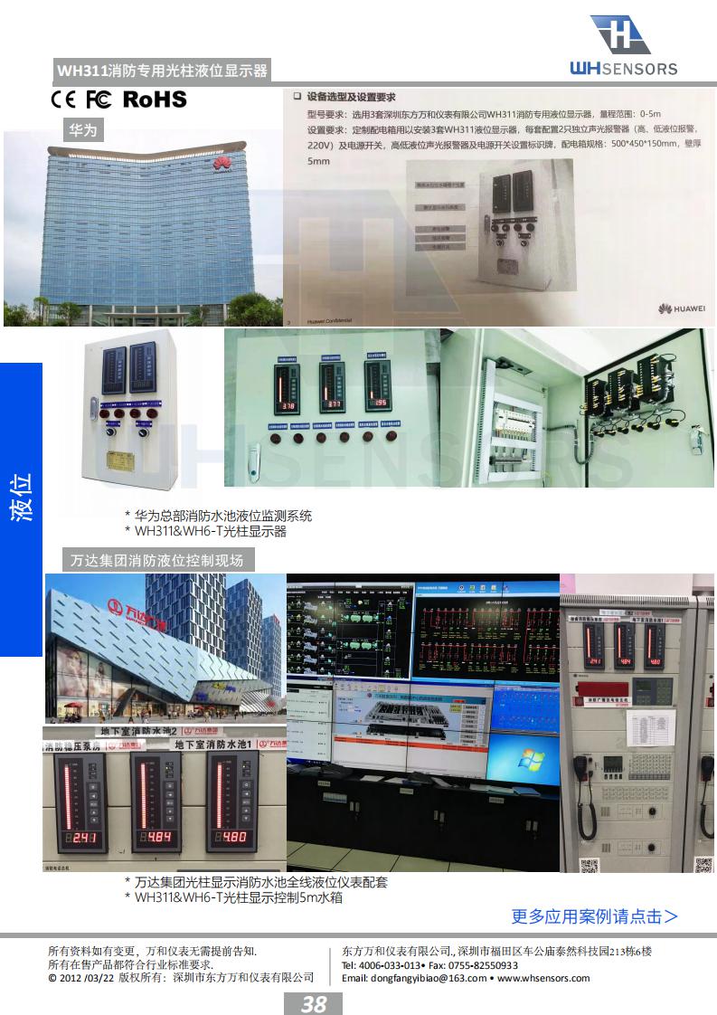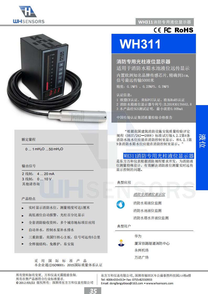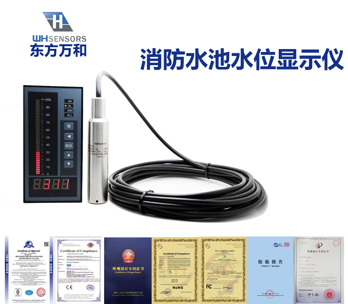 “根据我国建筑消防设施安装质量检验评定 规程(DB37/242—2008)标准试行版4.2.2第4条 消防水池水位应能在消防控制室显示,和4.2.3第 9条消防水箱水位应能在消防控制室显示。”东方 万和仪表根据规程要求开发出一款液位实时监测 系统,其中WH311水位探头直接投入安装到消防水 池或者水箱的底部,WH6液位专用显示器安装在消 防控制中心就可以实时监测消防水箱水池的实时 水位,并带有高低液位报警功能,确保消防水箱 水池在满水位运行。 WH311消防专用液位显示器专门 为消防液位测量而特殊设计,有效解决了消防液位 测量困难的问题。