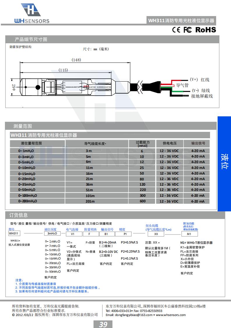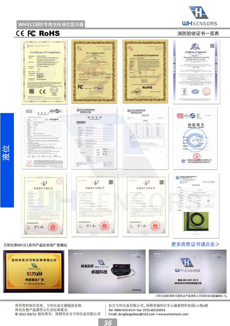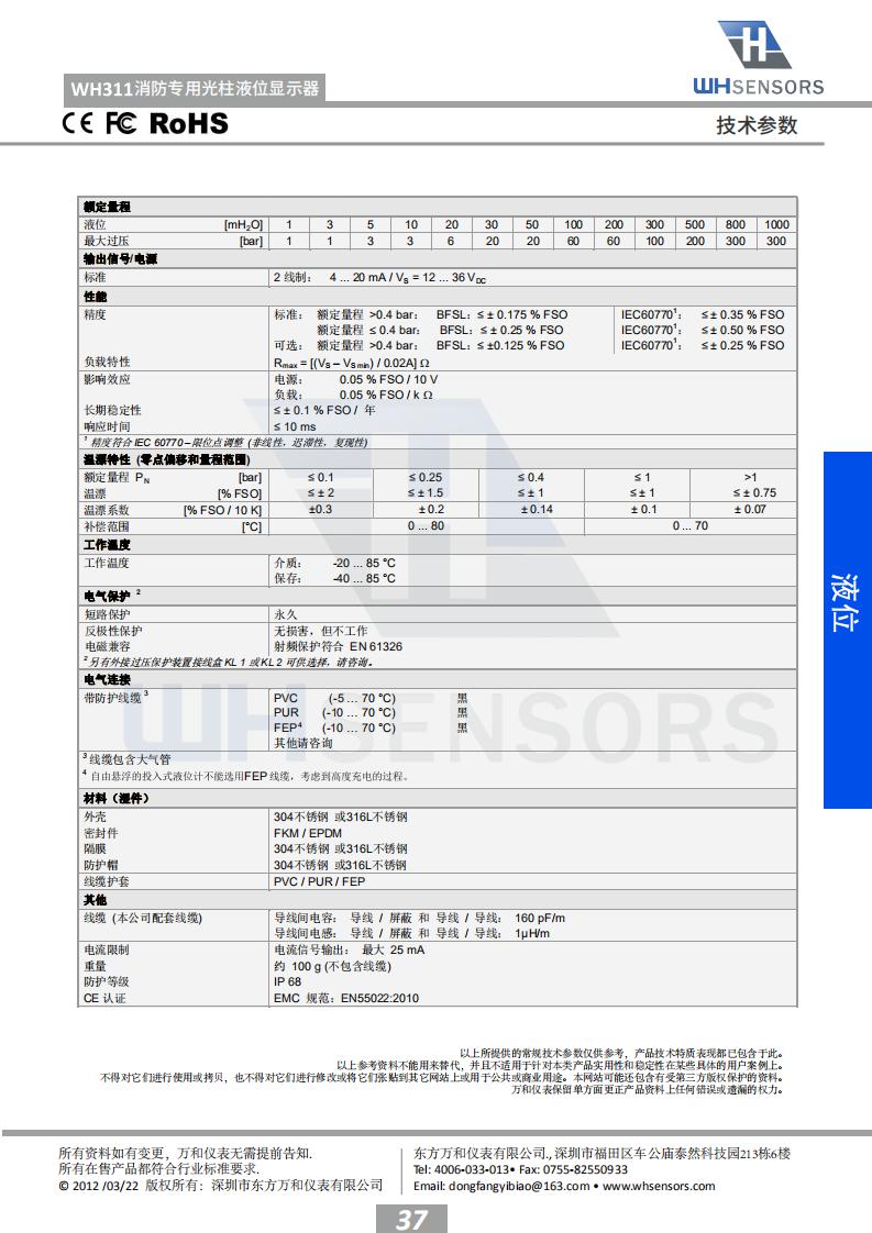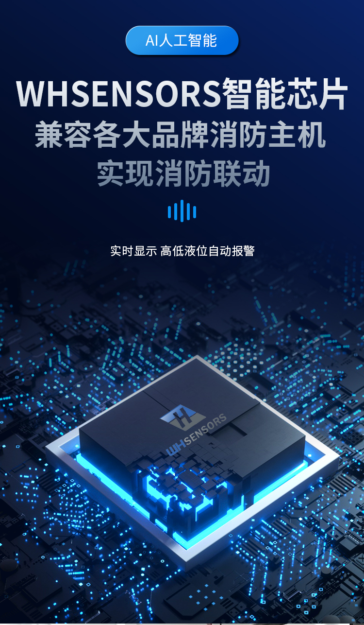“根据我国建筑消防设施安装质量检验评定 规程(DB37/242—2008)标准试行版4.2.2第4条 消防水池水位应能在消防控制室显示,和4.2.3第 9条消防水箱水位应能在消防控制室显示。”东方 万和仪表根据规程要求开发出一款液位实时监测 系统,其中WH311水位探头直接投入安装到消防水 池或者水箱的底部,WH6液位专用显示器安装在消 防控制中心就可以实时监测消防水箱水池的实时 水位,并带有高低液位报警功能,确保消防水箱 水池在满水位运行。 WH311消防专用液位显示器专门 为消防液位测量而特殊设计,有效解决了消防液位 测量困难的问题。