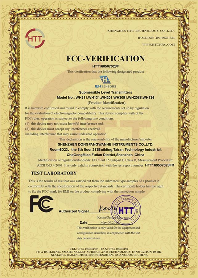 为了进一步打开美国市场,深圳市东方万和仪表有限公司在2016年6月9日通过FCC认证程序,取得FCC证书,为产品进军美国市场打下坚实基础!