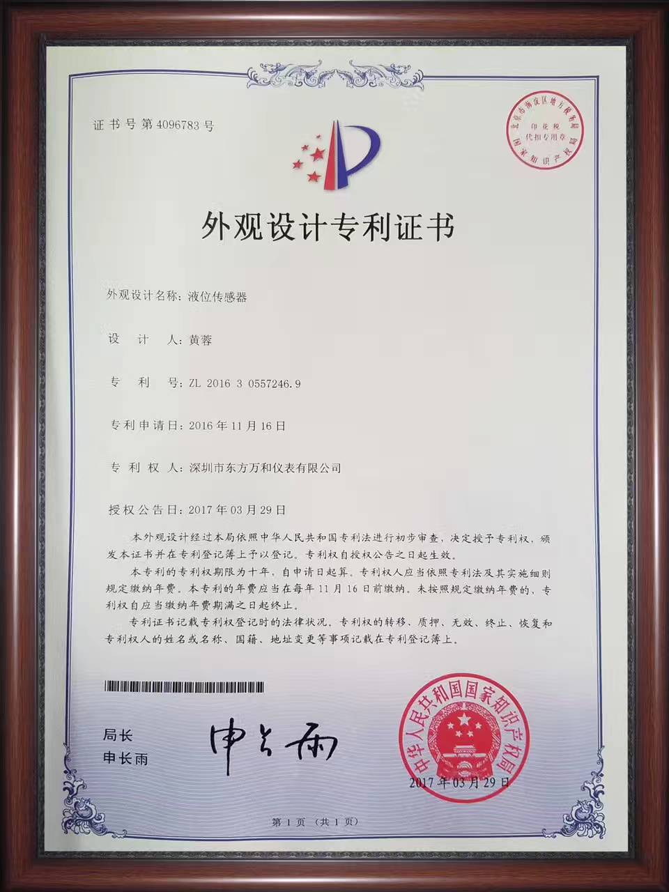 深圳市东方万和仪表有限公司在3月29号日取得国家知识产权局的专利证书,万和仪表技术公司用工匠精神精益求 精--把控每一个技术细节,为专业工程师提供更好的压力液位检测方案。这是暨我们产品顺利通过欧盟CE认证、RoHS认证和美国FCC认证之后的又一新的认证,标志着东方万和产品的技术性能和质量达到国际先进水平。